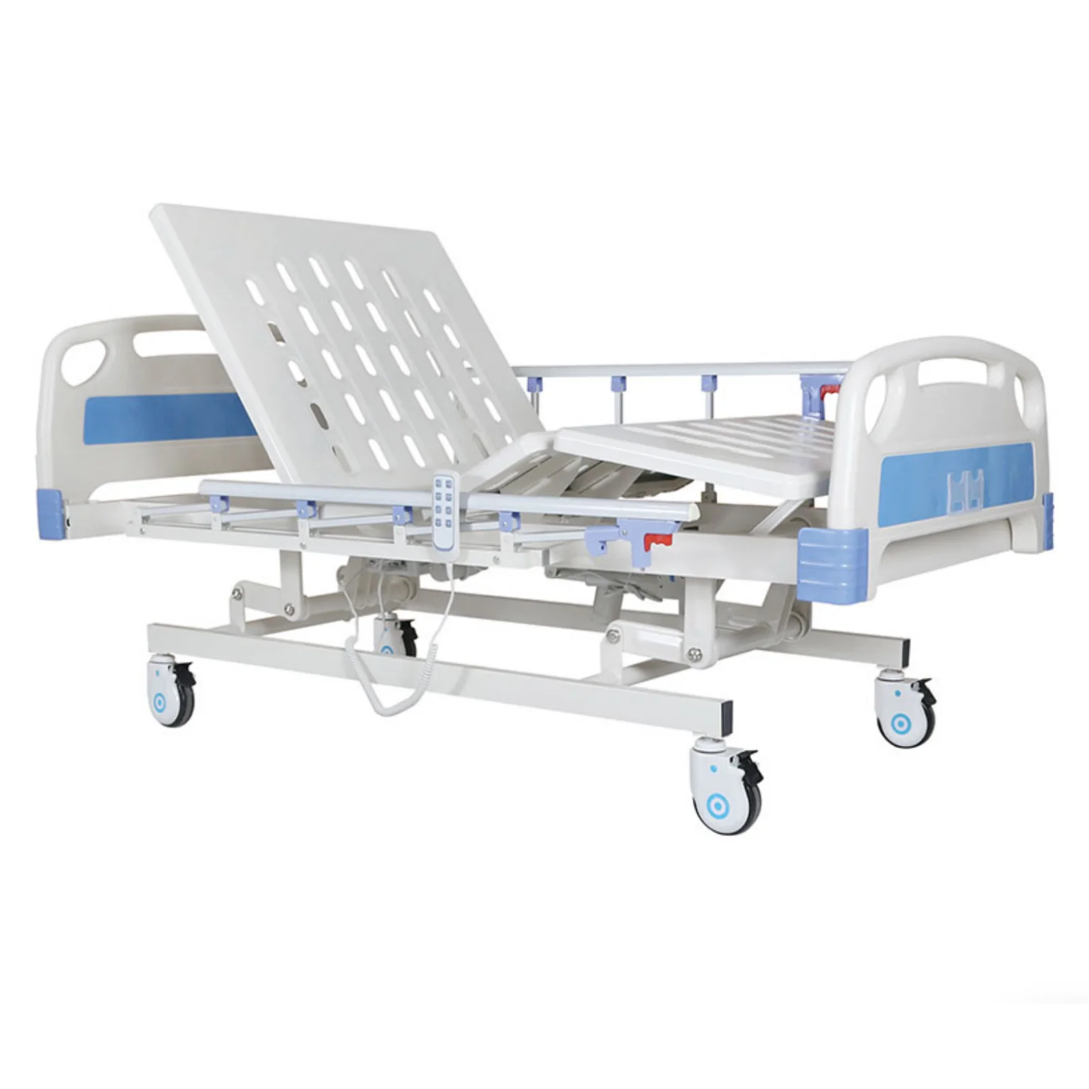 Electric hospital bed offering three essential functions for patient mobility and comfort. Remote control operation allows easy adjustment of backrest, leg, and bed height. Quiet motors ensure smooth transitions. A reliable option for hospitals and long-term care facilities.